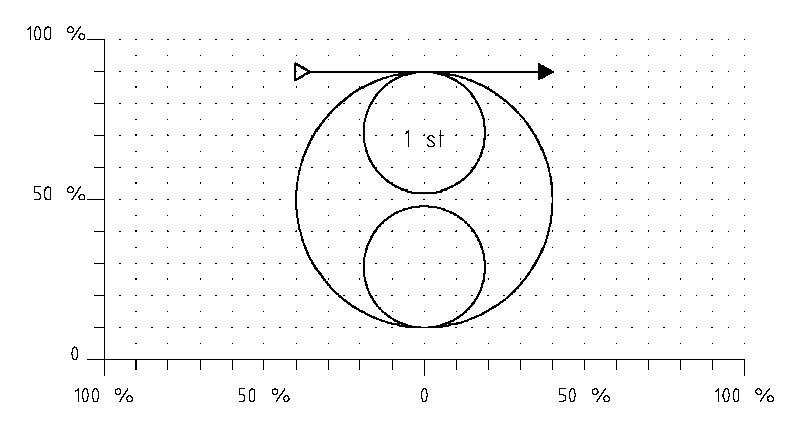 "In" is called at <40^90. The top small loop (diameter approximately 40%) is flown first. The large loop has an 80% diameter. The bottom of the large -and the small lower- circle are 10% of the ground. "Out" is called >40. During the whole figure the kite flies with its top in the flying direction. (So the lines will be twisted three times!)