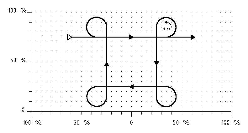 key elements: "IN" is called when the kite is flying horizontally at ^75<60, towards center window. At ^75>35 the first (3/4) loop is started, with a diameter of apporximately 20%. After flying the loop, fly downwards. The second (3/4) loop is started at ^15>25. After the four loops fly horizontally about 95%. "OUT" is called when the kite has reached ^75>60.