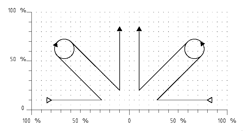 Donner le " in " quand les CV se dirigent vers le centre de la fentre avant qu'ils n'aient atteint <75 et >75. Quand ils sont à environ 30% du centre ils virent secs vers le haut et vers l'extérieur (un angle de 120o). Dès qu'ils ont atteint ^55 ils effectuent une boucle et demi avant de redescendre. A ^20, les deux CV tournent secs dans une verticale vers le haut. Les verticales doivent tre parallèles entre elles. Donner le " out " quand les CV atteignent ^80.