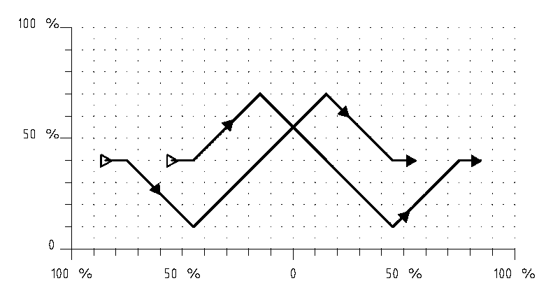 Donner le " in " quand les deux CV se dirigent vers le centre de la fenêtre à une distance d'au moins 25% l'un de l'autre et à ^40. Après un passage horizontal d'environ 10% les deux CV font un virage de 45o , l'un vers le haut, l'autre vers le bas. Quand le CV du haut atteint ^70, les deux font un angle de 90o . Quand l'autre CV atteint lui ^70, les deux font de nouveau un angle de 90o . Quand les deux CV atteignent ^40 ils se remettent sur une horizontale et ils se dirigent vers l'extérieur de la fenêtre. Donner le " out " après un passage de 10% sur une ligne horizontale.
