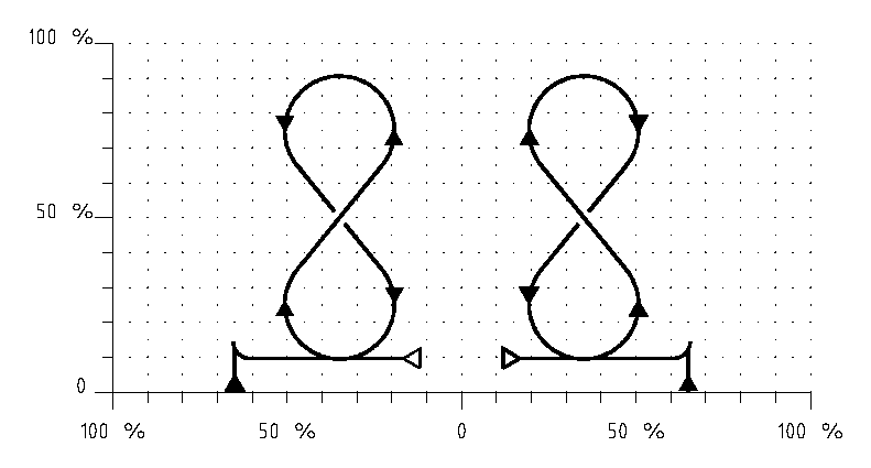 "In" is called when both kites are lined up at ^10. After 20% horizontal flight the kites simultaneously enter a 'eight' figure. The diameter of each arc is approximately 30% with the top at ^90. The point where the two straight lines intersect is at ^50. After returning to the same base-line the kites execute a simultaneous 2 (wings-)point landing. "Out" is called when both kites are landed. Both eights are mirrored compared to center window with the landings on the outer window side!