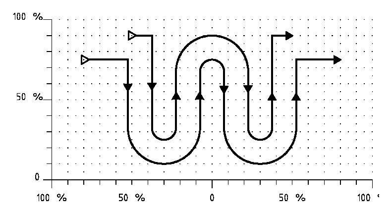 "In" is called when kites are flying horizontally at ^90, kite 2 at ^75; top kite at <60, bottom kite at <90. As bottom kite reaches ^75<52 it turns, flying downwards. Top kite then has already turned, both kites then flying at the same height. At all vertical stretches both kites fly at same height. Speedcontrol during curves is used to have entering as well as leaving the curves simultaneously. Distance between kites during vertical stretches and curves is a constant 15%. "Out" is called when the top kite has flown at least 20% on the top horizontal line, at ^90.