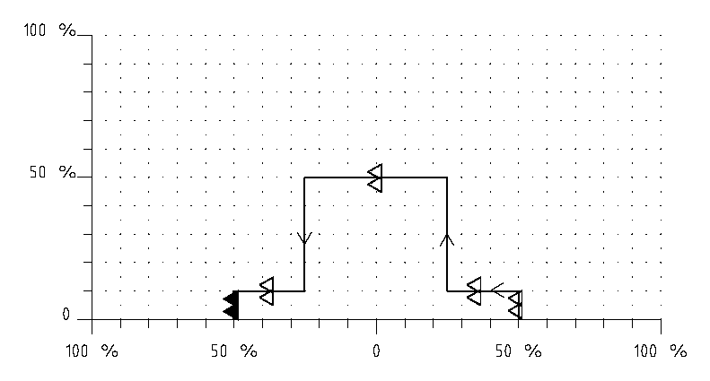 IN wird beim Start >50 angesagt. Der Drachen fliegt gerade zu ^10, dann horizontal nach >25, weiter vertikal zu >25^50, jetzt horizontal nach links für 50%, dann abwärts zu ^10, wieder gefolgt von einem Horizontalflug von 25% und dann abwärts zur Landung.