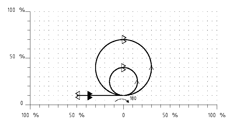 Donner le " in " à <40^10. Faire en premier le grand cercle d'un diamètre de 60%. Le point le plus bas du grand et du petit cercle sont à ^10. Après avoir effectué les deux cercle le CV pivote de 180 et revient vers la gauche. Donner le " out " à <40. (Pendant les tours, le CV reste en marche avant.)