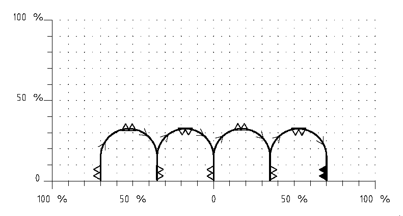"In" is called at starting point, with the kite in vertical position, the right wing touching the ground at about <70. A straight line upwards is flown until about ^15 is reached. Then a semi-circle is flown, diameter 35%. The kite is brought back downwards, touching the ground with the left wingtip at <35. Three similar arcs are flown afterwards. All ground-touches (except of course at "IN" and "OUT") should last no longer than approximately 2 seconds. "Out" is called when the kite lands at its right wingtip at >70.