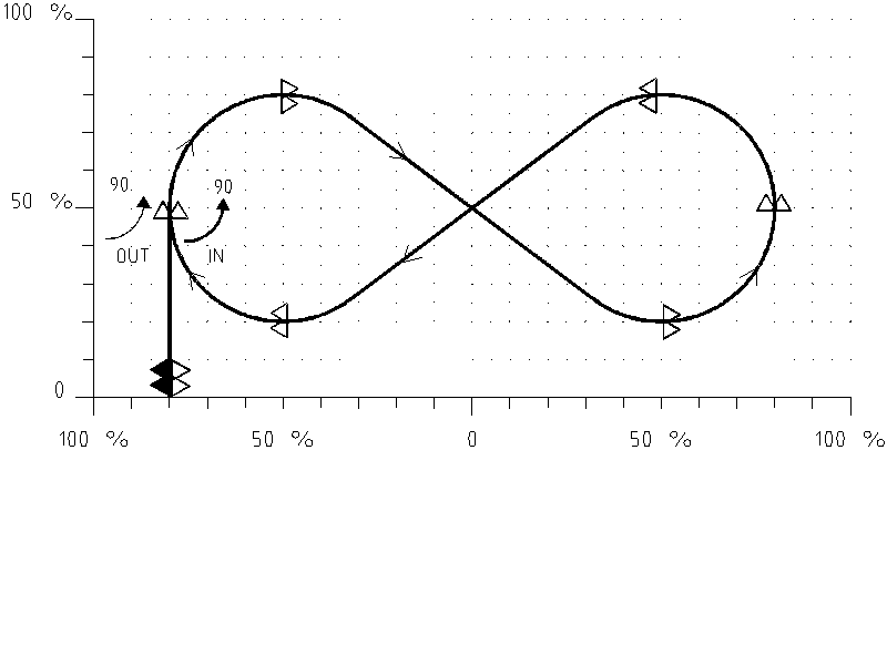 "In" is called when the kite is at ^0<80, resting on a wingtip in a "standing" position. After 50% vertical flight the kite turns 90 counter clock wise (c.c.w.) and enters the 'eight' figure, flying backwards. The diameter of each arc is approximately 30% with the bottom of the 'eight' at ^20. The point where the two straight lines intersect is at ^50 height. The kite "leaves" the 'eight' figure at ^50<80, the same point where it entered, after again performing a 90 c.c.w. turn. "OUT" is called after the kite travels downwards vertically, has landed on a wingtip and is still "standing".