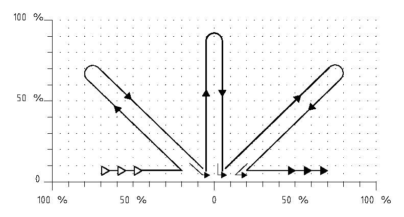 "In"' is called as soon as the first kite has entered the horizontal line at ^7. Once the team is centred in the wind window each kite simultaneously "bursts" out and up to form an equally spaced dome figure reaching the edge of each individual kite's window at the same time. All kites turn clockwise, return into the centre and travel approximately 20% along the same horizontal line at ^7, before "Out" is called.