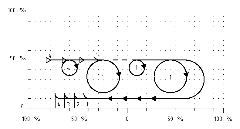 IN wird angesagt, wenn alle Drachen in gleichen Abständen auf einer Horizontalen bei ^50 und dem 1. Drachen bei mindestens <20%. Alle Drachen fliegen gleichzeitig einen Kreis mit einem Durchmesser von etwa 15%. Danach fliegen alle Drachen wieder auf der Horizontalen **at ^50** bis der 1. Drachen bei etwa >50 angelangt ist. Jetzt fliegen alle Drachen gleichzeitig einen Kreis mit einem Durchmesser von etwa 40%. Alle Drachen folgen nun dem 1.Drachen einen Bogen abwärts auf eine Horzontale bei ^10. Wenn der 1. Drachen bei <40 angekommen ist, landet er auf den Flügelspitzen, der 2. Drachen fliegt über den 1. hinweg und landet ebenfalls auf gleiche Art usw. Die Landung erfolgt direkt, weshalb das Diagramm eine kurze Aufwärtsbewegung der Drachen zeigt.