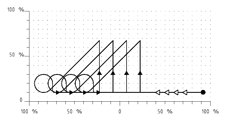 Donner le " in " quand tous les CV sont sur une ligne horizontale à ^10 et quand le premier CV est à environ >50. Tous les CV exécutent un virage de 90 vers le haut en même temps (les lignes verticales sont régulièrement espacées autour du centre de la fenêtre). Tous les CV font un virage d'environ 315 dès qu'ils ont atteint ^70 et descendent parallèlement en diagonale. Quand ils se retrouvent à ^10, avec le premier CV à environ <20, ils exécutent tous trois quart de cercle vers le haut et reviennent en courbe sur la ligne horizontale à ^10. Donner le " out " quand le premier CV (en fait le no. 4) atteint au moins >10. Les autres le suivent avec des espacements réguliers.